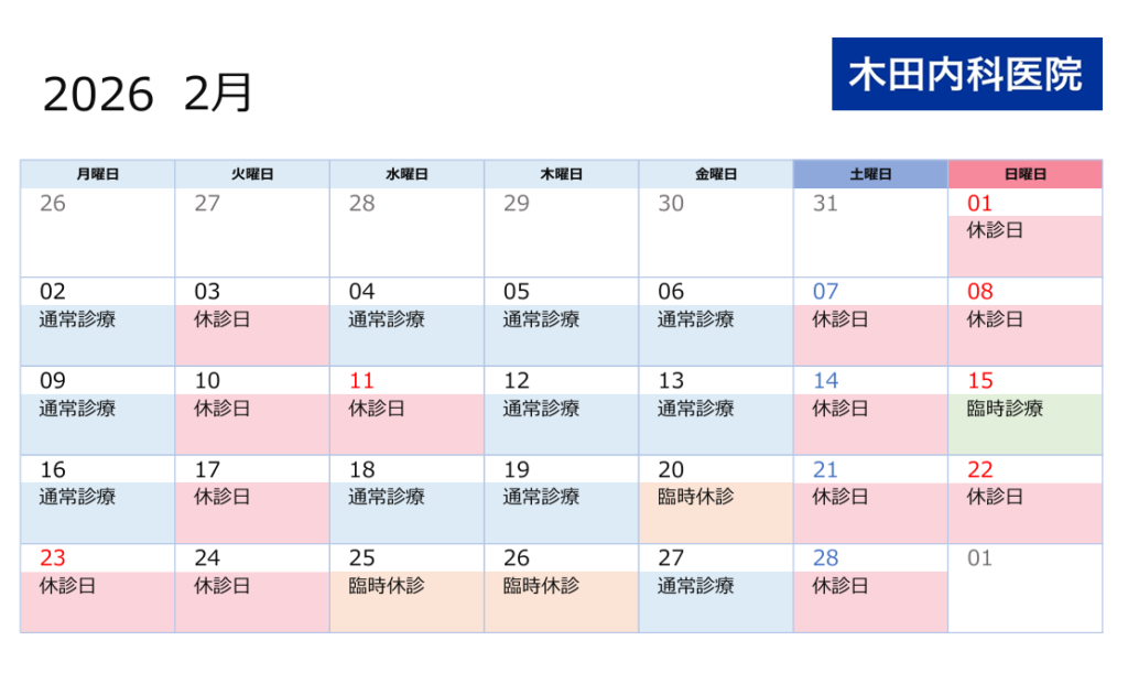 こんにちは、木田内科医院です。2月の予定です(*^^*)