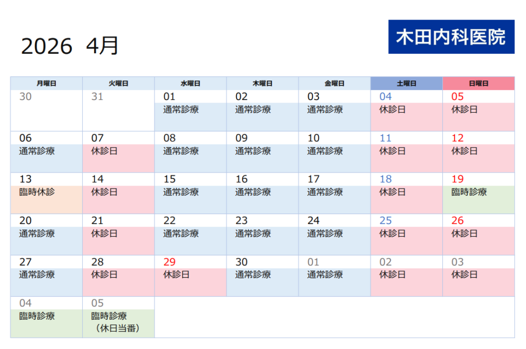 こんにちは、木田内科医院です。4月の予定です(*^^*)