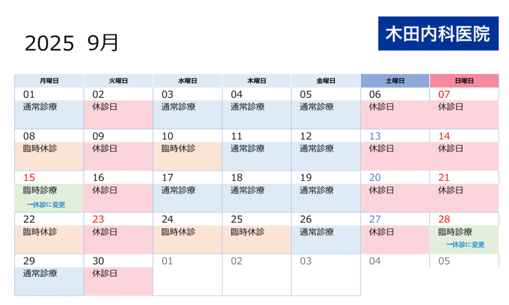 こんにちは、木田内科医院です。9月の予定です(*^^*)