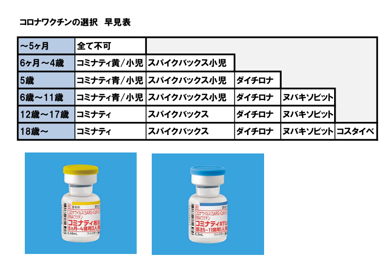 現在の小児向け新型コロナワクチンは、下記早見表の通り選択が可能です。参考にしてください。