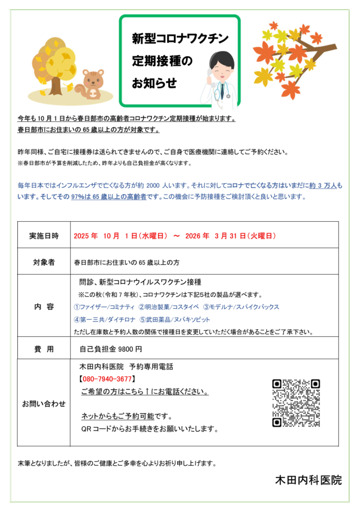 また、高齢者向けのコロナワクチン定期接種は3月31日で終了となります。次回は10月1日~となりますので、ご希望の方はお早めにご予約をお願い致します。