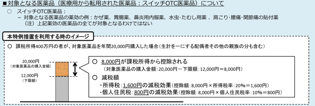 特定一般用医薬品等購入費とは、医師によって処方される医薬品(医療用医薬品)から、ドラッグストアで購入できるOTC医薬品に転用された医薬品(スイッチOTC医薬品)等の購入費をいいます。